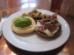 Crêpeville’s “The Burger” consists of a 1/2 lb of ground chuck with sautéed red onions, mushrooms, avocado, jack cheese, and mayonnaise on a sesame bun. I used to love sautéed or grilled onions over raw onions, but it now depends on what kind of onions: if the onions are yellow or white I say grill/sauté them, but the sweet taste of the red onion is lost to some extent when cooked.