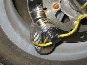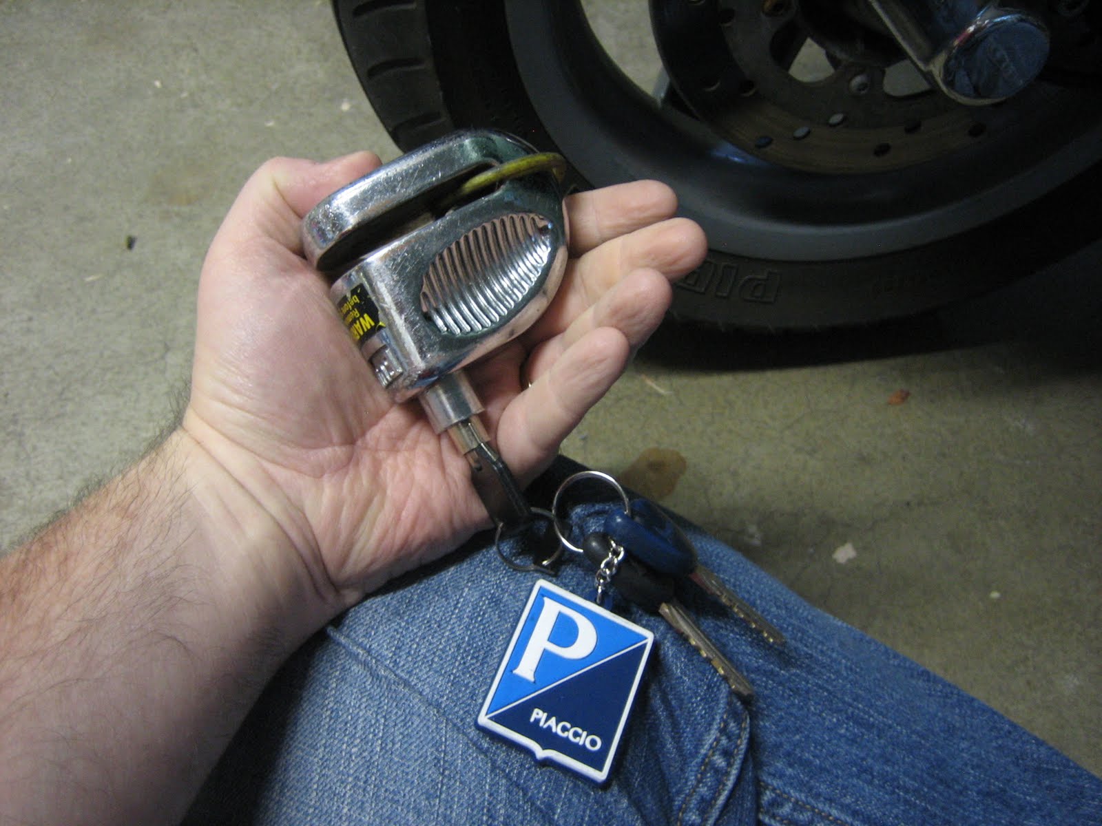 My Vespa has a locking steering column which when employed protects against theft, but for those who have vintage scooters or someone who wants another layer of security there are other ways to reduce scooter theft. One of these is disc lock. A disc lock is usually made of hardened metal and is mounted on a hole in your front disc brake. The lock usually comes with a lock-reminder cable that the operator loops around the handlebar. The reminder cable ensures the operator does not try to ride off with the lock still in place. While this system works, it is cumbersome and time consuming to operate. For this reason, I rarely employ mine.The Scoot Shop is now selling the Grip-Lock. This lock appears to be a much quicker and more convenient way to secure your scooter than using a disc lock. Here’s a video on how it works: