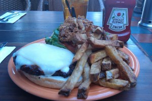 Double Barrel Ale BBQ sauce, which adds a little smoky heat to the meat. The burger is topped with crispy onions that give the burger a delightful crunch along with the robust taste that comes with combining onions and beef. The high stack of fried onions makes the burger a little too tall and the sauces can be a messy, but the combination is worth the challange.