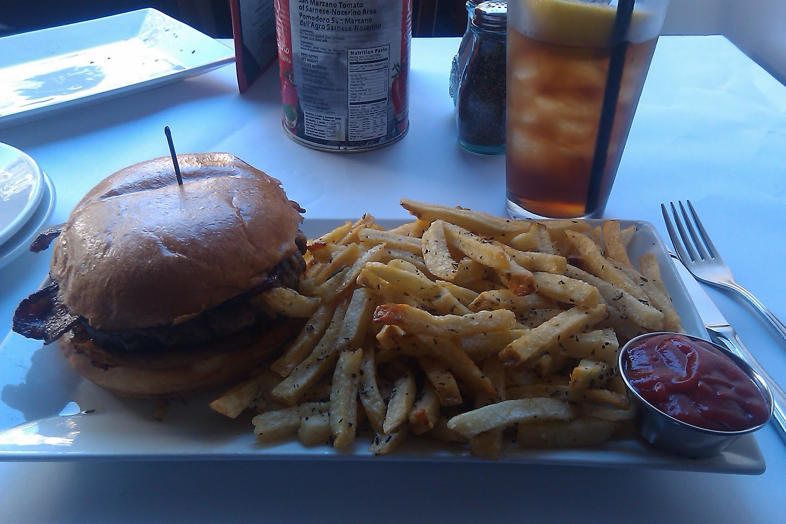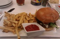 The Gorgonzola Burger is at least a 1/3–lb. Kobe beef patty, Gorgonzola cheese, pesto mayonnaise, romaine lettuce, and tomato on a very good and durable bun. The pesto mayo is subtle, not overbearing, so it does not conflict with the unique Gorgonzola cheese taste. The Gorgonzola Burger does not come with pickles or onions—which maybe wise omissions, since the Gorgonzola would not have worked well with these elements. If I have a complaint about this burger, it would be that the chef has a tendency to go a bit overboard with the Gorgonzola. I have had this burger twice—once it was terrific but another time it was a little too much. Still, I will definitely come back for this very good burger.