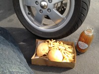 Of course, with a chuck wagon affair, the food is intended to be eaten at home or in one’s car. I ate next to my scooter in the parking lot, however, so the shortage of napkins was annoying. It is obviously very difficult to monitor and replenish such items, including bottled or canned drinks and accoutrements, when the staff members are located directly over these items.