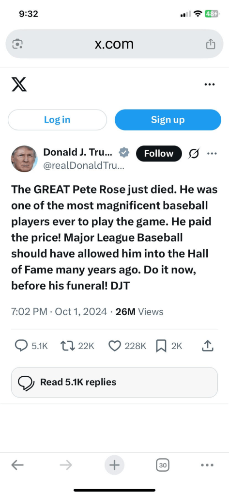 Some baseball fans commented that Rose should have been honored while he was alive. Others thought a lifetime sentence for Rose et al. was enough, and it was a good time to make them eligible. Donald Trump, the Disrupter-in-Chief, thought he should have been honored while still alive. What do you know? That’s one more thing I disagree with Trump and Manfred on.